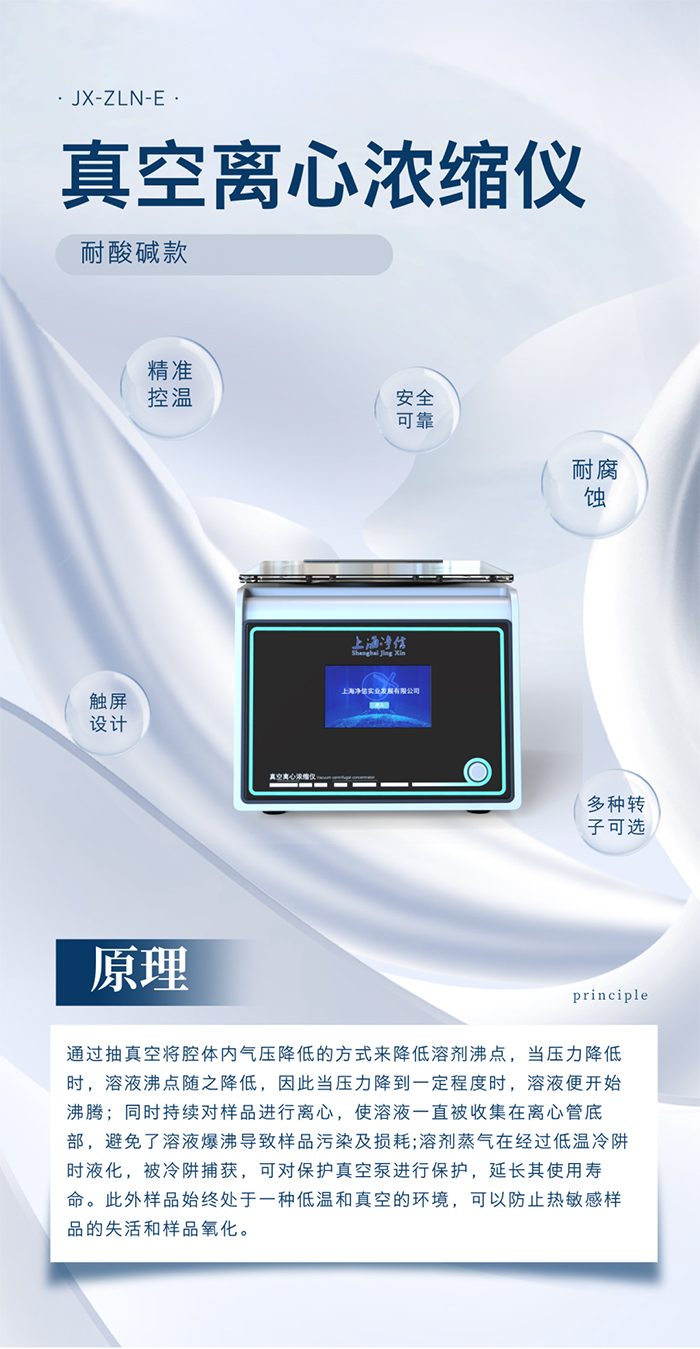 耐酸堿真空離心濃縮儀,整機防腐處理,耐酸堿耐有機溶劑設計。可用于化學、生物、醫藥等領域的樣品制備和分析,在生命科學領域中,常用于分離和濃縮蛋白質、核酸和其他生物分子。真空離心濃縮是一種將溶劑蒸發出去以濃縮或干燥生物(非生物)樣品的過程。采用離心力、真空和加熱相結合的方法使樣品中的溶劑快速蒸發,從而達到離心濃縮樣品的目的,方便后續實驗的分析和檢測。