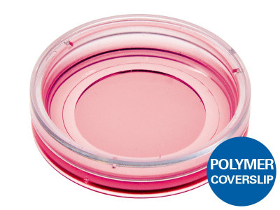 The μ-Dish 35 mm, low comes with a thin ibidi Polymer Coverslip Bottom that has the highest optical quality (comparable to glass) and is ideally suitable for high-resolution microscopy. It is also available as μ-Dish 35 mm, low Glass Bottom with a #1.5H Glass Coverslip Bottom for TIRF or single molecule microscopy.