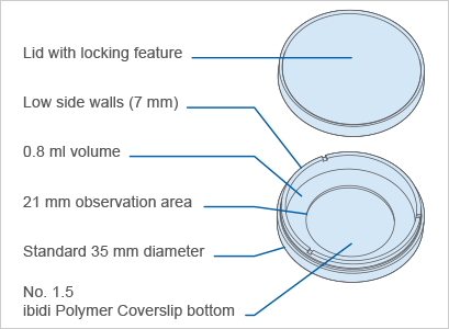 Also available as μ-Dish 35 mm, low Glass Bottom with a #1.5H Glass Coverslip Bottom, which is specifically suited for TIRF and single-molecule applications