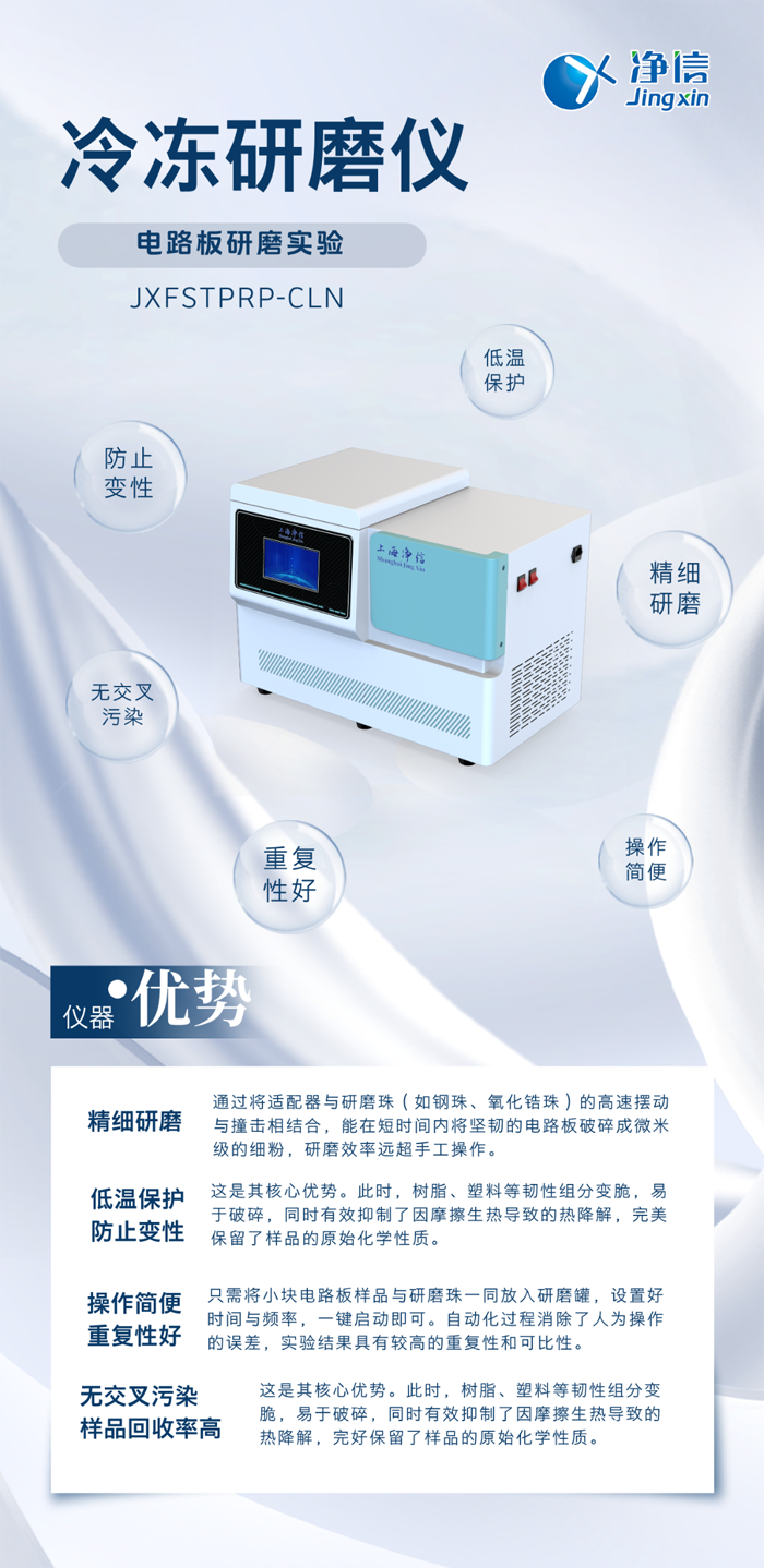 凈信冷凍研磨儀憑借其低溫、避免污染的研磨特性,成功解決了電路板這類復雜復合材料的前處理難題。它不僅是提升RoHS檢測、材料成分分析等數(shù)據(jù)準確性的“得力助手”,也是在電子廢棄物資源回收領(lǐng)域進行物料分析的“神兵利器”。選擇凈信冷凍研磨儀,意味著選擇了一條通往更可靠實驗結(jié)果的捷徑,為您的科研與質(zhì)控工作提供了強有力的技術(shù)保障。