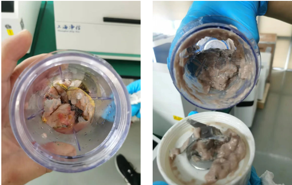 本次實驗使用上海凈信的平行研磨儀對魚肉研磨后的肉泥非常均勻,無大塊顆粒,魚皮也被研磨充分,實驗效果非常好,用戶很滿意。