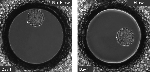 L929成纖維細胞在μ-Slide球狀體灌注中顯示出球狀體,Bioinert,第1至14天,接種濃度為5 x 10 5單細胞/ ml。左:無灌注,第二天換培養基。右:使用ibidi泵系統灌注,0.75毫升/分鐘。相差顯微鏡,10倍物鏡,孔直徑800 μm。