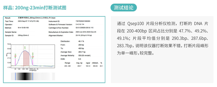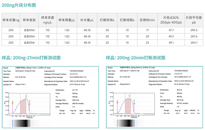 現針對提取的一管全血DNA樣本,投入量分別是200ng加入到0.2ml離心管中,具體實驗條件及打斷后的片段分布圖如下: